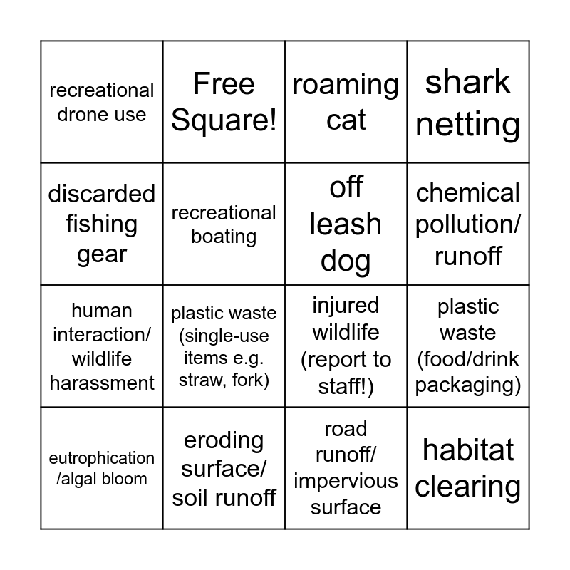 This bingo card has 17 words: road runoff/ impervious surface, eutrophication /algal bloom, roaming cat, recreational drone use, plastic waste (single-use items e.g. straw, fork), shark netting, plastic waste (food/drink packaging), off leash dog, chemical pollution/ runoff, recreational boating, eroding surface/ soil runoff, injured wildlife (report to staff!), discarded fishing gear, Free Square!, human interaction/ wildlife harassment, rats/mice (invasive species), noise pollution and habitat clearing.