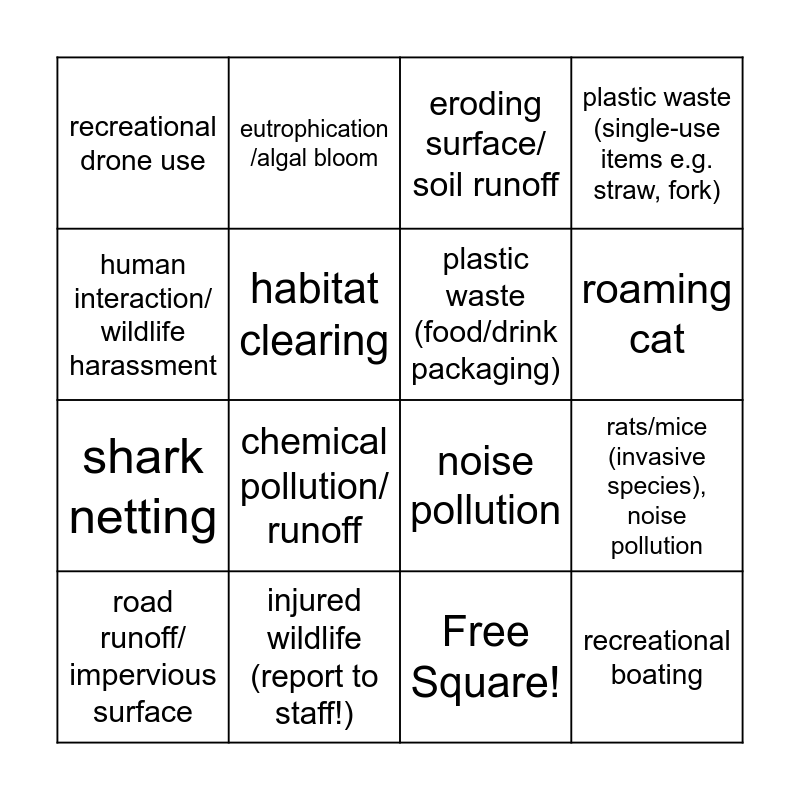This bingo card has 18 words: chemical pollution/ runoff, recreational boating, eroding surface/ soil runoff, recreational drone use, noise pollution, plastic waste (single-use items e.g. straw, fork), road runoff/ impervious surface, eutrophication /algal bloom, roaming cat, shark netting, Free Square!, human interaction/ wildlife harassment, rats/mice (invasive species), noise pollution, habitat clearing, plastic waste (food/drink packaging), off leash dog, injured wildlife (report to staff!) and discarded fishing gear.