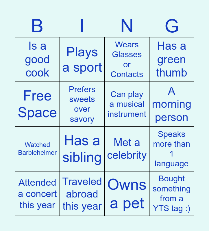 This bingo card has 16 words: Traveled abroad this year, Speaks more than 1 language, Wears Glasses or Contacts, Is a good cook, Watched Barbieheimer, Plays a sport, Met a celebrity, Owns a pet, Free Space, Prefers sweets over savory, Attended a concert this year, Has a green thumb, Has a sibling, A morning person, Can play a musical instrument and Bought something from a YTS tag :).