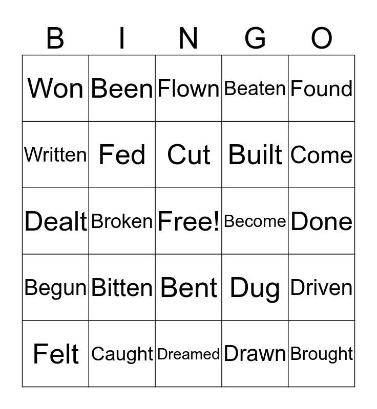 This bingo card has a free space and 24 words: Bitten, Caught, Cut, Felt, Found, Won, Written, Been, Become, Bent, Built, Dealt, Dug, Driven, Fed, Drawn, Done, Flown, Come, Broken, Brought, Begun, Beaten and Dreamed.