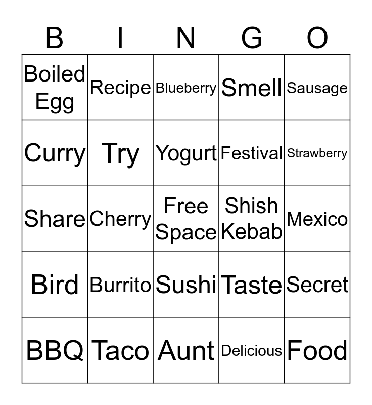 This bingo card has a free space and 24 words: Burrito, Taco, Yogurt, BBQ, Sausage, Boiled Egg, Curry, Recipe, Shish Kebab, Sushi, Festival, Share, Taste, Secret, Try, Delicious, Mexico, Blueberry, Strawberry, Cherry, Food, Bird, Smell and Aunt.