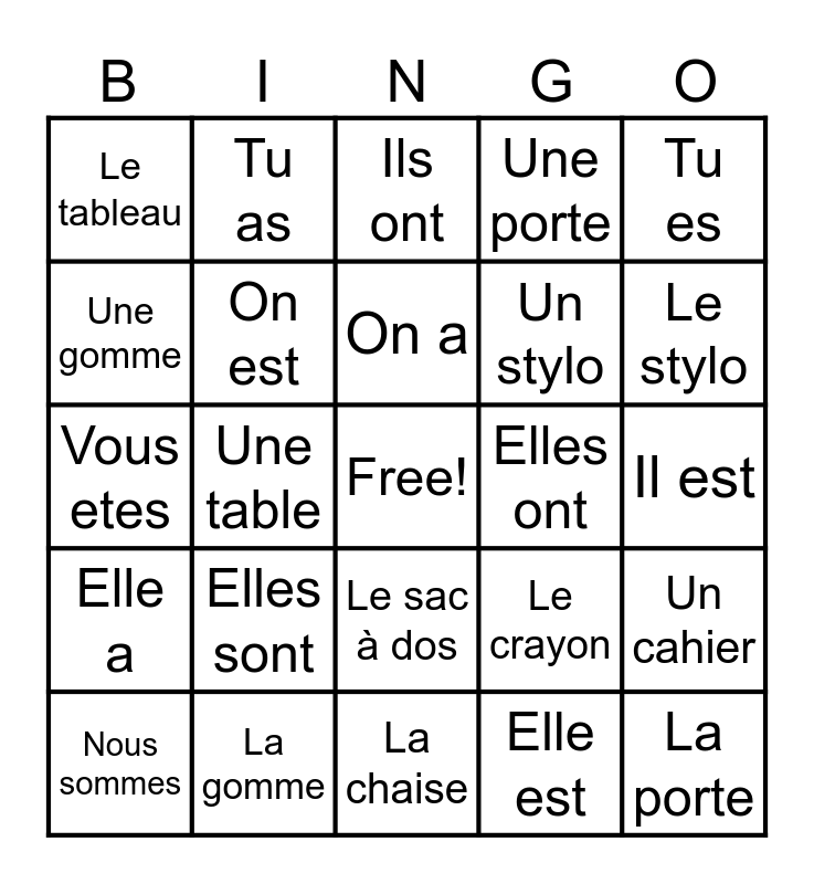 This bingo card has a free space and 34 words: Je suis, Elle est, J'ai, Il a, Elle a, On est, Tu es, Nous sommes, Tu as, Nous avons, On a, Ils ont, Ils sont, Vous avez, Elles ont, Le stylo, La gomme, Vous etes, Elles sont, Le crayon, Le sac à dos, La table, Le tableau, Il est, La chaise, La porte, Une porte, Un livre, Un stylo, Une gomme, Le livre, Une table, Un cahier and Le cahier.