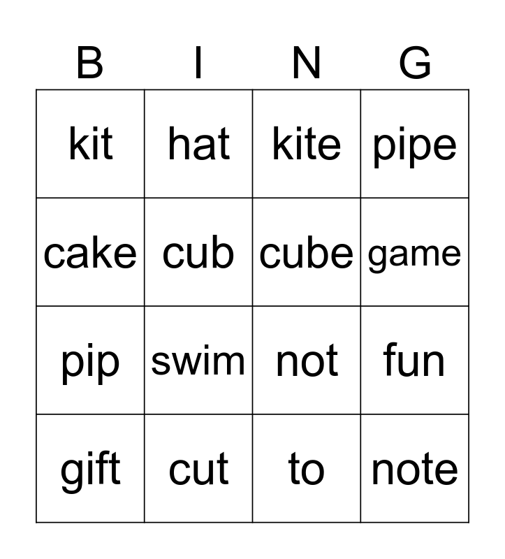 This bingo card has 22 words: cut, cute, hat, hate, cub, cube, kit, kite, not, note, pip, pipe, go, in, to, my, fun, gift, swim, cake, game and the.