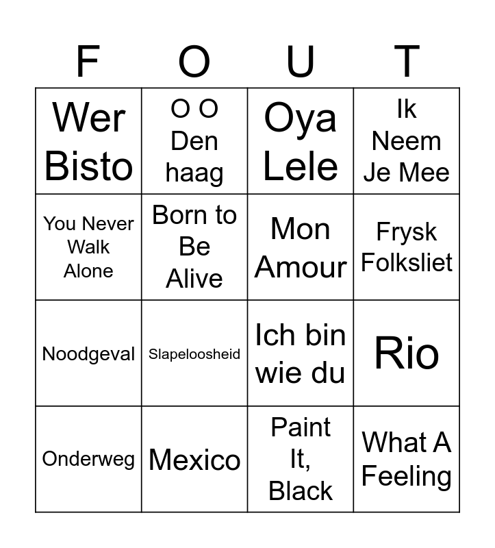 This bingo card has 85 words: Dicke Titten, Kartoffelsalat, Een Beetje Meer, Oya Lele, Ik Ga Zwemmen, Engelbewaarder, Vrede, Belle Helene, Spetter Pieter Pater, Atemlos durch die Nacht, Zijn het je ogen, Suspicious Minds, Paradise By The Dashboard Light, Mon Amour, Mexico, Belgie (Is er Leven Op Pluto), Wer Bisto, Strjitlizzer, Born to Be Alive, The Second Waltz, Twee Motten, Zwemmen Zonder Slip, Noodgeval, Onderweg, Limburg, Rio, Maniac, I’m Still Standing, Break My Stride, Don’t Stop Me Now, You’re The One That I Want, Have You ever Been Mellow, You Can’t Hurry Love’, Tragedy, Ich bin wie du, Ademnood, Later Als Ik Groter Ben, I’m in the Mood for Dancing, 99 Luftballons, What A Feeling, Slapeloosheid, Ome Jan, Een Kopje Koffie, Stiekem Gedanst, Just Say Hello!, Blijven Slapen, Frans Duits, Vrijgezel, Dansen Op De vulkaan, Het is Altijd Lente in de Ogen van de Tandartsassistente, Daar Gaat ze, O O Den haag, Frysk Folksliet, When The Lady Smiles, Jukte op e rech, Polonaise Hollandaise, Can’t Get You out of My Head, Fireball, Ik Neem Je Mee, Smoke On The Water, Starships, Candy, Cheerleader, Stiekem, Het Regent Zonnestralen, De Vlieger, You Never Walk Alone, Dancing Queen, Ghostbusters, Rhythm Is A Dancer, Laura, Ik Moet Nog Wat Jaren Mee, Hendrik Haverkamp, Take Me Home, Country Roads, Pizza Calzone, Rivers of Babylon, Slow Down, Wannabe, Wasmasjien, The Final Countdown, Eye of The Tiger, Paint It, Black, Baby One More Time, Girls Just Want To Have Fun, One Way Wind and What Is Love.