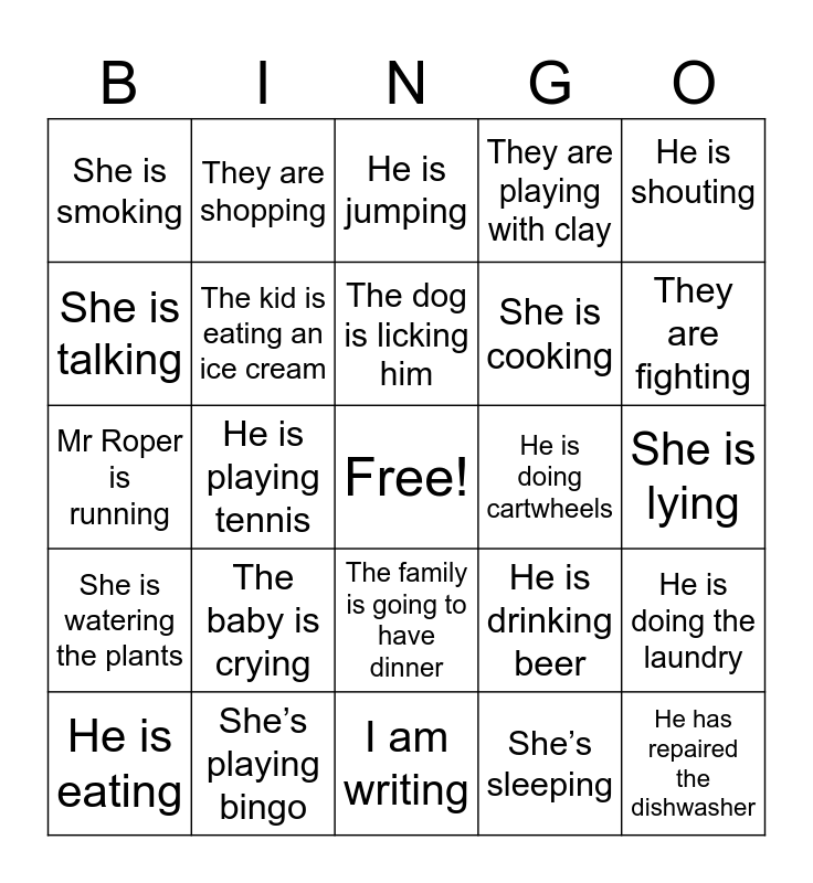 This bingo card has a free space and 25 words: The baby is crying, I am writing, The dog is licking him, He is eating, He is shouting, She is smoking, She is talking, They are shopping, He is doing cartwheels, The family is going to have dinner, She is cooking, Mr Roper is running, He is drinking beer, He is doing the laundry, The kid is eating an ice cream, She is on a trapeze, She is lying, He is jumping, They are fighting, He is playing tennis, He has repaired the dishwasher, She’s playing bingo, She is watering the plants, They are playing with clay and She’s sleeping.