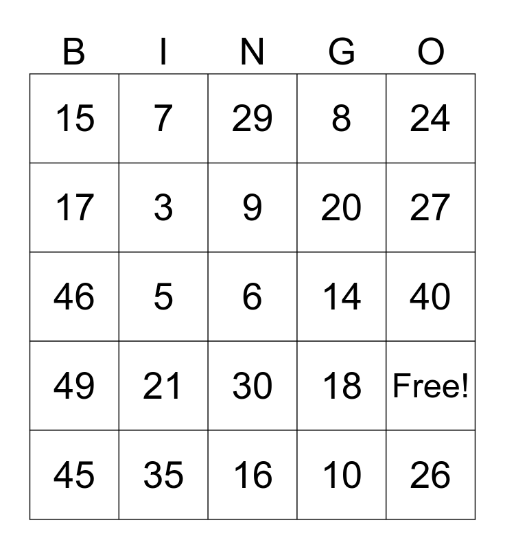 This bingo card has 50 words: 1, 6, 11, 16, 21, 2, 7, 12, 17, 22, 3, 8, Free!, 18, 23, 4, 9, 14, 19, 24, 5, 10, 15, 20, 25, 26, 27, 28, 29, 30, 31, 32, 33, 34, 35, 36, 37, 38, 39, 40, 41, 42, 43, 44, 45, 46, 47, 48, 49 and 50.