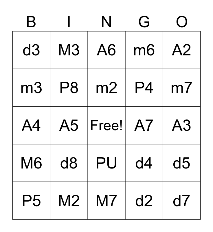 This bingo card has a free space and 26 words: PU, d2, m2, M2, A2, d3, m3, M3, A3, d4, P4, A4, d5, P5, A5, d6, m6, M6, A6, d7, m7, M7, A7, d8, P8 and A8.