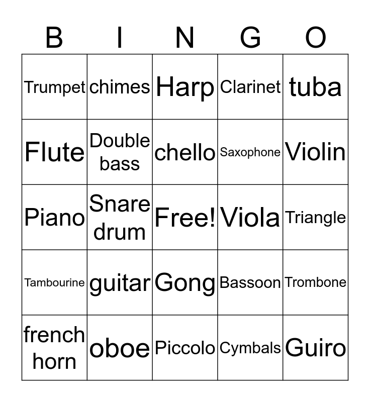 This bingo card has a free space and 24 words: guitar, oboe, chello, french horn, tuba, Trumpet, Flute, chimes, Viola, Gong, Saxophone, Piano, Bassoon, Trombone, Double bass, Cymbals, Triangle, Harp, Violin, Snare drum, Guiro, Tambourine, Clarinet and Piccolo.