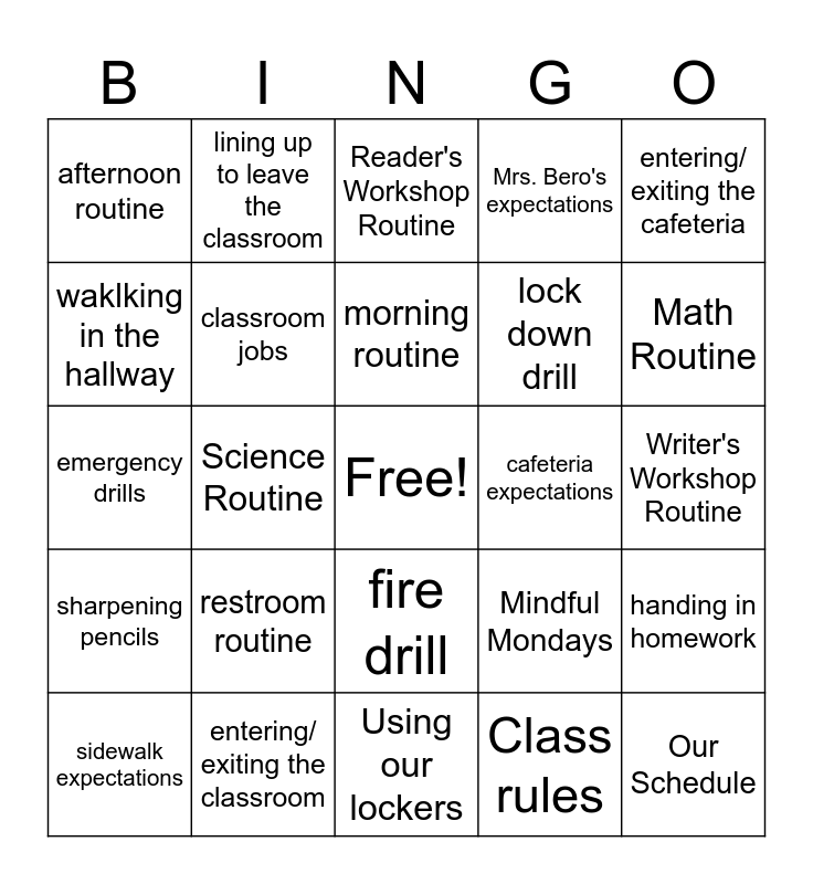 This bingo card has a free space and 24 words: restroom routine, entering/ exiting the classroom, morning routine, sidewalk expectations, entering/ exiting the cafeteria, afternoon routine, waklking in the hallway, lining up to leave the classroom, cafeteria expectations, fire drill, lock down drill, emergency drills, Mindful Mondays, handing in homework, classroom jobs, Class rules, Writer's Workshop Routine, Reader's Workshop Routine, Math Routine, Science Routine, Our Schedule, sharpening pencils, Mrs. Bero's expectations and Using our lockers.