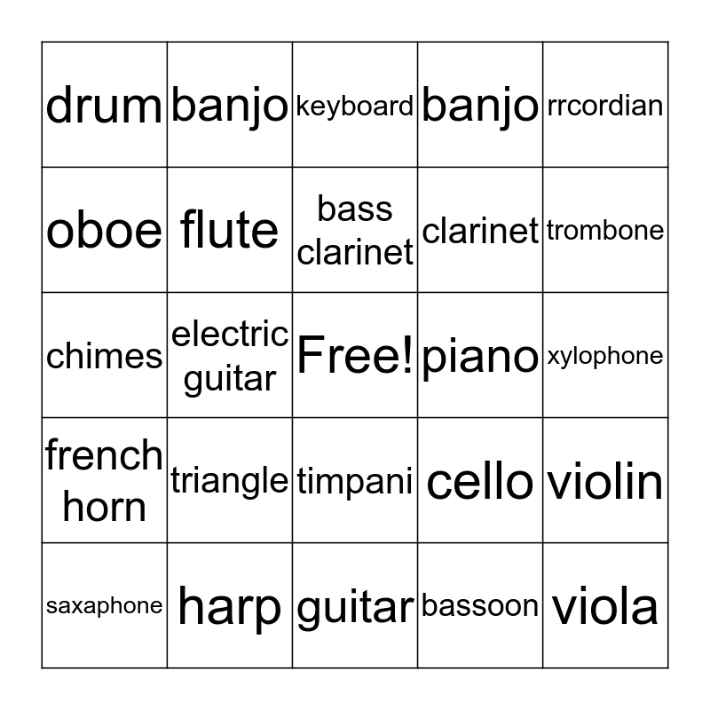 This bingo card has a free space and 24 words: triangle, harp, bass clarinet, saxaphone, rrcordian, drum, oboe, banjo, piano, timpani, clarinet, chimes, cello, violin, flute, bassoon, xylophone, keyboard, trombone, electric guitar, viola, french horn, banjo and guitar.