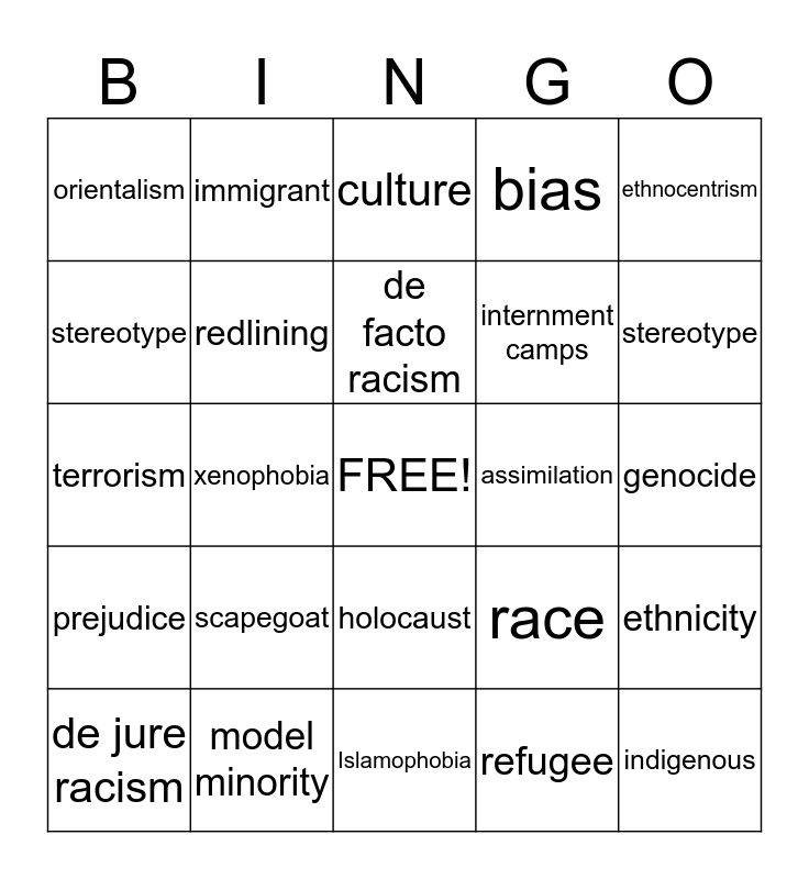 This bingo card has a free space and 24 words: scapegoat, model minority, de facto racism, de jure racism, ethnocentrism, orientalism, stereotype, immigrant, assimilation, holocaust, internment camps, terrorism, race, ethnicity, redlining, refugee, genocide, culture, stereotype, xenophobia, indigenous, prejudice, bias and Islamophobia.