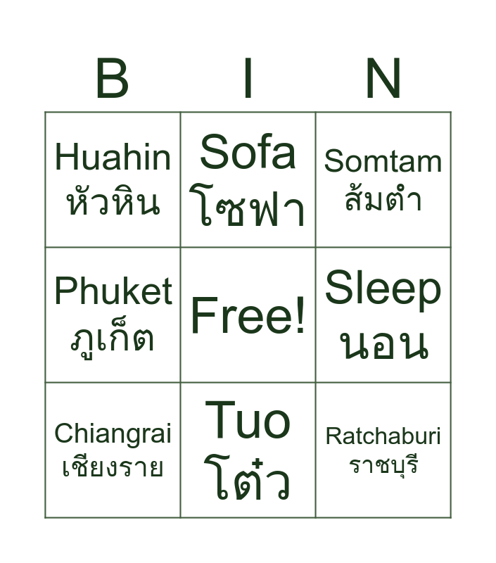 This bingo card has a free space and 11 words: Nick นิก, Tuo โต๋ว, Ratchaburi ราชบุรี, Chiangrai เชียงราย, Sofa โซฟา, Somtam ส้มตำ, Sleep นอน, Working ทำงาน, Phuket ภูเก็ต, Huahin หัวหิน and Home บ้าน.