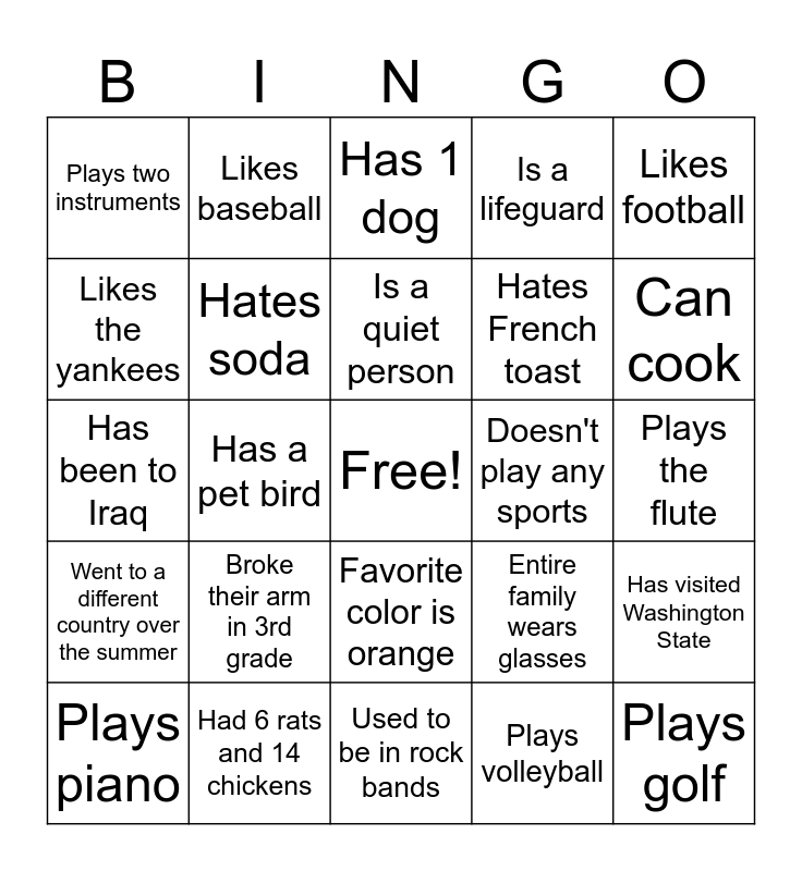 This bingo card has a free space and 31 words: Used to be in rock bands, Works at a dog shelter, Has a pet bird, Sat alone in airport for 9+ hours, Plays two instruments, Has 1 dog, Hates soda, Entire family wears glasses, Doesn't play any sports, Plays volleyball, Plays the flute, Plays golf, Has a twin, Has never been to Olive Garden, Can cook, Has written published poems, Has visited Washington State, Broke their arm in 3rd grade, Went to a different country over the summer, Favorite color is orange, Likes football, Went camping in the woods for a week, Plays piano, Likes baseball, Hates French toast, Likes the yankees, Is a lifeguard, Has been to Iraq, Had 6 rats and 14 chickens, Is a quiet person and Is allergic to cats.
