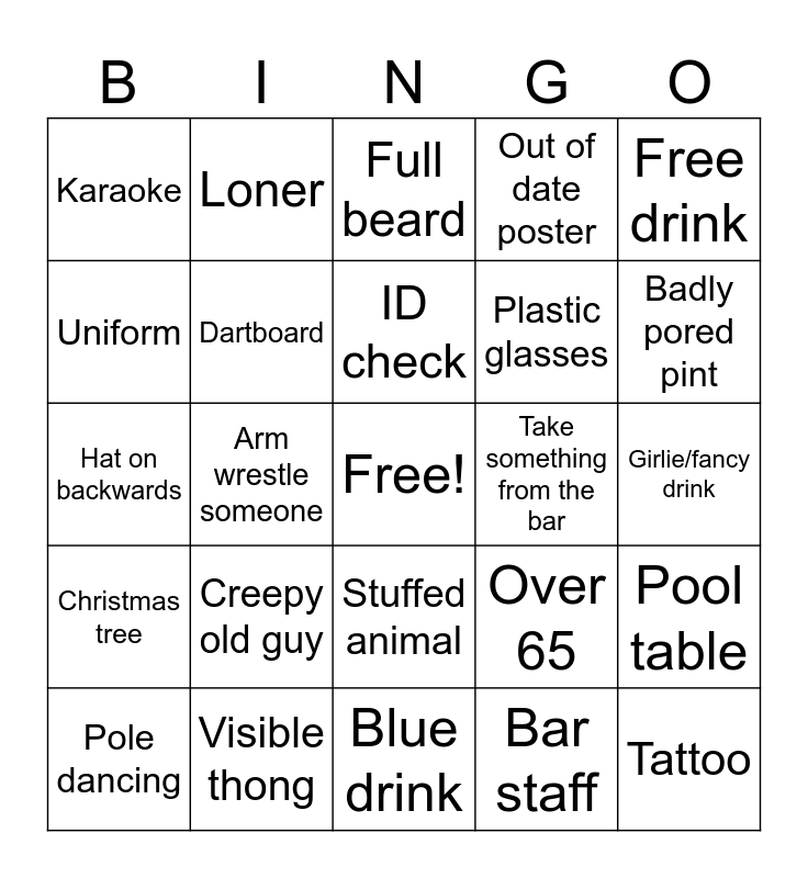 This bingo card has a free space and 24 words: Creepy old guy, Visible thong, ID check, Pole dancing, Free drink, Karaoke, Uniform, Loner, Take something from the bar, Stuffed animal, Plastic glasses, Hat on backwards, Over 65, Pool table, Dartboard, Bar staff, Girlie/fancy drink, Full beard, Badly pored pint, Arm wrestle someone, Tattoo, Christmas tree, Out of date poster and Blue drink.