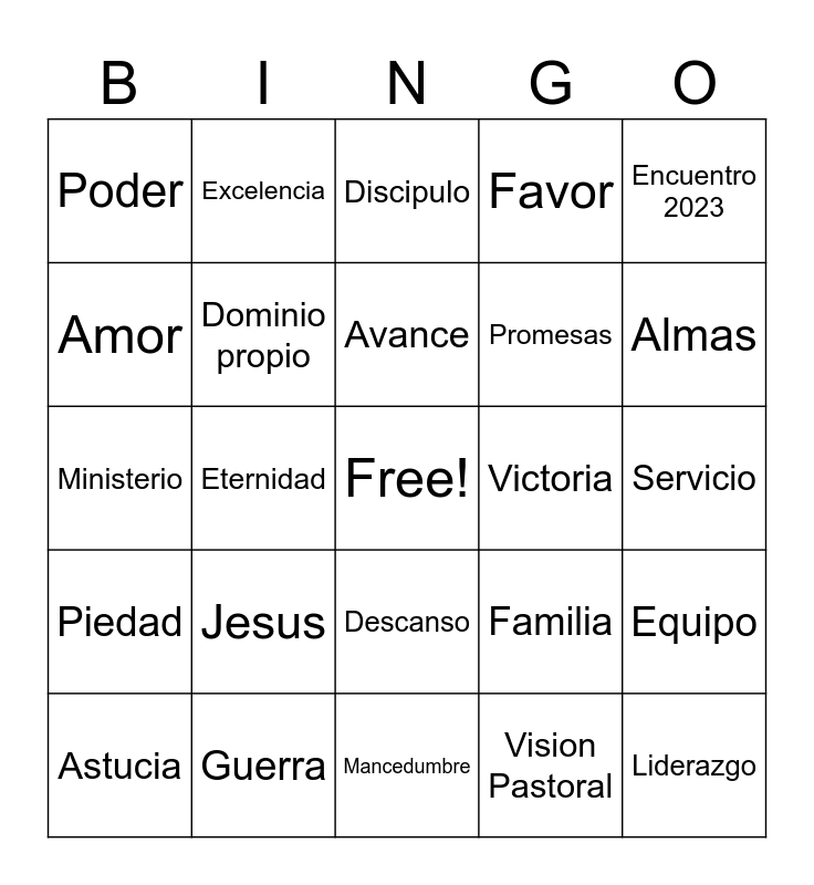 This bingo card has a free space and 42 words: Avance, Avance, Expansion, Jesus, Vision Pastoral, Equipo, Liderazgo, Mentor, Discipulo, Descanso, Servicio, Almas, Eternidad, Encuentro 2023, Espiritu Santo, Familia, Proposito, Ministerio, Conexion, Excelencia, Amor, Pasion, Cruz, Poder, Fruto, Restauracion, Promesas, Paz, Gozo, Bondad, Benignidad, Piedad, Dominio propio, Mancedumbre, Templanza, Astucia, Guerra, Victoria, Cristo, Gracia, Favor and Ilimitado.