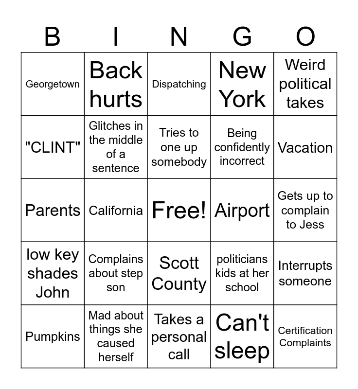 This bingo card has a free space and 38 words: Stephen, Cats, Florida, Glitches in the middle of a sentence, Interrupts someone, Complains about step son, Tries to one up somebody, Tiramisu, Weird political takes, Being confidently incorrect, California, New York, Certification Complaints, Gets up to complain to Jess, "CLINT", low key shades John, Speaks over someone, Dispatching, Vaguely implies that she thinks she's law enforcement, Airport, Georgetown, Mad about things she caused herself, Vacation, Pumpkins, Actually answers the phone, Takes a personal call, Ignores someone when they ask for her help, Inserts herself into conversations, Tries to help someone who didn't ask for help, Does weird decorations that aren't holiday related, Hawaii fire, Scott County, Can't sleep, Back hurts, Sayre school, politicians kids at her school, Parents and Grandparents.