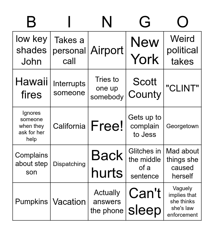 This bingo card has a free space and 36 words: Stephen, Cats, Florida, Interrupts someone, Glitches in the middle of a sentence, Complains about step son, Tries to one up somebody, Tiramisu, Weird political takes, Being confidently incorrect, California, New York, Certification Complaints, Gets up to complain to Jess, "CLINT", low key shades John, Speaks over someone, Dispatching, Vaguely implies that she thinks she's law enforcement, Airport, Georgetown, Mad about things she caused herself, Vacation, Pumpkins, Actually answers the phone, Takes a personal call, Ignores someone when they ask for her help, Inserts herself into conversations, Scott County, Hawaii fires, Parents, Grandparents, Can't sleep, Back hurts, Sayre School and Mitch McConnell.