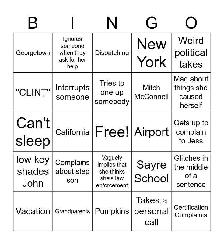 This bingo card has a free space and 37 words: Stephen, Cats, Florida, Interrupts someone, Glitches in the middle of a sentence, Complains about step son, Tries to one up somebody, Tiramisu, Weird political takes, Being confidently incorrect, California, New York, Certification Complaints, Gets up to complain to Jess, "CLINT", low key shades John, Speaks over someone, Dispatching, Vaguely implies that she thinks she's law enforcement, Airport, Georgetown, Mad about things she caused herself, Vacation, Pumpkins, Actually answers the phone, Takes a personal call, Ignores someone when they ask for her help, Inserts herself into conversations, Scott County, Hawaii fires, Parents, Grandparents, Can't sleep, Back hurts, Sayre School, Mitch McConnell and Stephens Vehicle.