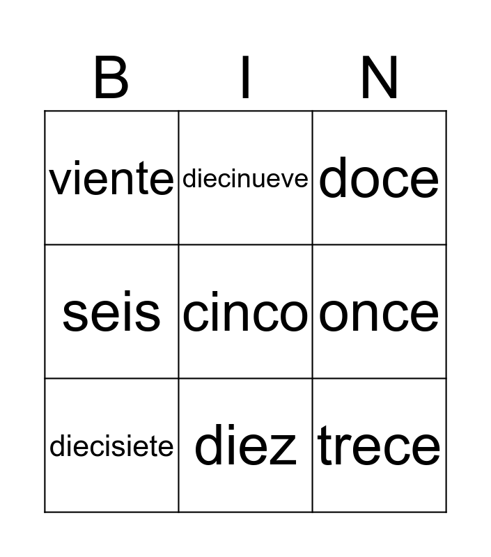 This bingo card has a free space and 8 words: once, doce, diecinueve, diecisiete, viente, trece, seis and diez.