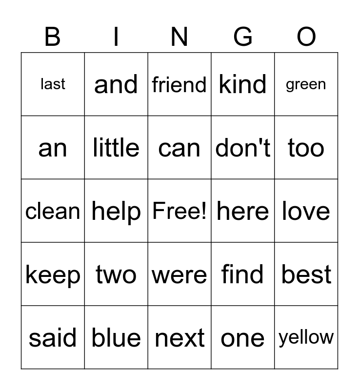 This bingo card has a free space and 29 words: said, four, help, your, last, friend, little, two, here, blue, love, yellow, next, one, too, color, were, keep, green, clean, find, went, don't, an, kind, and, best, can and sleep.