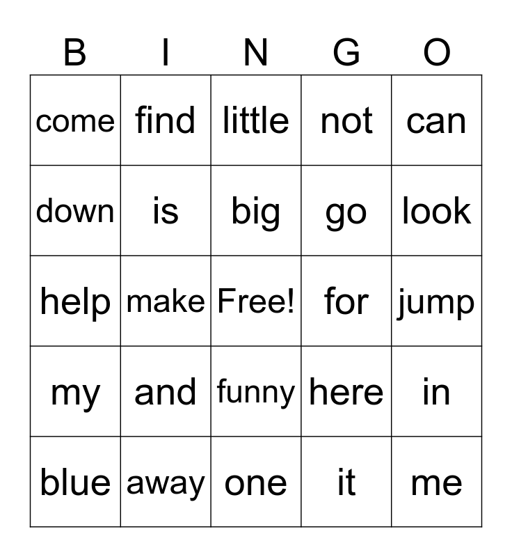 This bingo card has a free space and 24 words: and, away, big, blue, can, come, down, find, for, funny, go, help, here, in, is, it, jump, little, look, make, me, my, not and one.
