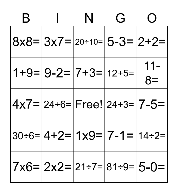 This bingo card has a free space and 24 words: 4+2=, 2x2=, 7+3=, 7x6=, 2+2=, 8x8=, 1+9=, 3x7=, 24+3=, 1x9=, 12+5=, 4x7=, 7-1=, 14÷2=, 9-2=, 81÷9=, 7-5=, 20÷10=, 11-8=, 24÷6=, 5-0=, 30÷6=, 5-3= and 21÷7=.
