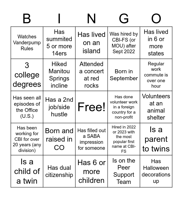 This bingo card has a free space and 27 words: Hired in 2022 or 2023 with the most popular first name at CBI-FS, Who currently owns a boat, Born in September, Has 6 or more children, 3 college degrees, Has lived on an island, Has summited 5 or more 14ers, Has been working for CBI for over 20 years (any division), Has done volunteer work in a foreign country for a non-profit, Is a parent to twins, Has seen all episodes of the Office (U.S.), Was hired by CBI-FS (or MOU) after Sept 2022, Is a child of a twin, Has dual citizenship, Regular work commute is over one hour, Has been in the military, Hiked Manitou Springs incline, Attended a concert at red rocks, Born and raised in CO, Watches Vanderpump Rules, Volunteers at an animal shelter, Is on the Peer Support Team, Has a 2nd job/side hustle, Has Halloween decorations up, Has filled out a SABA impression for someone, Has lived in 6 or more states and Has flown in a helicopter.