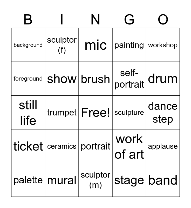This bingo card has a free space and 24 words: ceramics, mural, brush, palette, workshop, background, foreground, sculptor (f), sculpture, portrait, self-portrait, still life, work of art, applause, show, stage, dance step, mic, drum, trumpet, band, ticket, painting and sculptor (m).