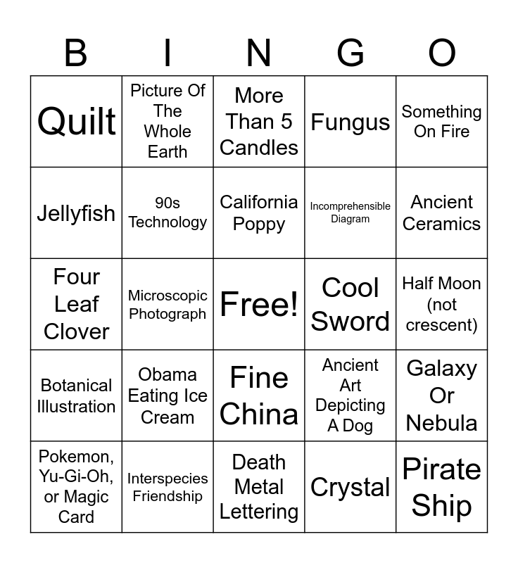 This bingo card has a free space and 24 words: Obama Eating Ice Cream, Interspecies Friendship, California Poppy, Pokemon, Yu-Gi-Oh, or Magic Card, Something On Fire, Quilt, Jellyfish, Picture Of The Whole Earth, Cool Sword, Fine China, Incomprehensible Diagram, Four Leaf Clover, Ancient Art Depicting A Dog, Galaxy Or Nebula, 90s Technology, Crystal, Half Moon (not crescent), More Than 5 Candles, Ancient Ceramics, Microscopic Photograph, Pirate Ship, Botanical Illustration, Fungus and Death Metal Lettering.
