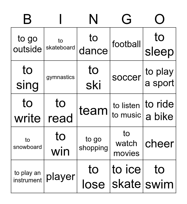 This bingo card has a free space and 24 words: to win, player, to ski, to play an instrument, to sleep, to go outside, to sing, to skateboard, to listen to music, to go shopping, soccer, to write, to watch movies, cheer, gymnastics, to ice skate, to ride a bike, to dance, to play a sport, to read, to swim, to snowboard, football and to lose.