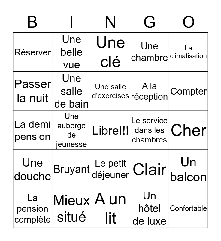 This bingo card has a free space and 32 words: Un hôtel de luxe, Une auberge, Une auberge de jeunesse, Loger, Une douche, Une salle de bain, La climatisation, Un balcon, Une belle vue, En especes, Une salle d'exercises, Une clé, Une carte de crédit, Une piscine, Le service dans les chambres, Un ascenseur, La pension complète, La demi pension, Le petit déjeuner, Bruyant, Clair, Spacieux Spacieuse, Cher, Mieux situé, Confortable, Une chambre, A la réception, Passer la nuit, Réserver, A un lit, A deux lits and Compter.