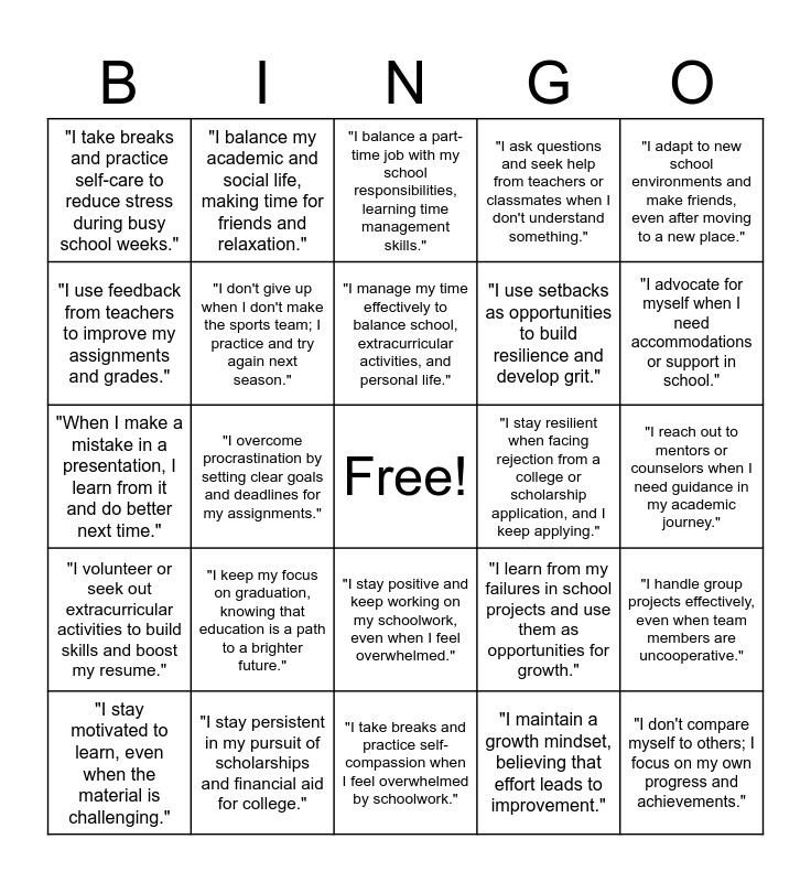 This bingo card has a free space and 35 words: "Even when I struggle with a tough subject, I keep trying until I understand it.", "I bounce back from a bad test grade by studying harder for the next one.", "When I face a challenging project, I break it down into smaller tasks and tackle them one by one.", "I don't give up when I don't make the sports team; I practice and try again next season.", "I stay positive and keep working on my schoolwork, even when I feel overwhelmed.", "I ask questions and seek help from teachers or classmates when I don't understand something.", "I use feedback from teachers to improve my assignments and grades.", "I stay focused on my long-term goals, like getting into college, even when things get tough.", "I manage my time effectively to balance school, extracurricular activities, and personal life.", "I stay organized with planners and to-do lists to stay on top of my schoolwork.", "When I make a mistake in a presentation, I learn from it and do better next time.", "I adapt to new school environments and make friends, even after moving to a new place.", "I don't let bullying or peer pressure affect my self-esteem or well-being.", "I keep my cool during exams and focus on each question, rather than getting anxious.", "I take breaks and practice self-care to reduce stress during busy school weeks.", "I stay resilient when facing rejection from a college or scholarship application, and I keep applying.", "I maintain a growth mindset, believing that effort leads to improvement.", "I overcome procrastination by setting clear goals and deadlines for my assignments.", "I volunteer or seek out extracurricular activities to build skills and boost my resume.", "I don't compare myself to others; I focus on my own progress and achievements.", "I learn from my failures in school projects and use them as opportunities for growth.", "I stay motivated to learn, even when the material is challenging.", "I handle group projects effectively, even when team members are uncooperative.", "I stay persistent in my pursuit of scholarships and financial aid for college.", "I balance a part-time job with my school responsibilities, learning time management skills.", "I advocate for myself when I need accommodations or support in school.", "I stay engaged and participate in class discussions, even if I'm shy or introverted.", "I maintain a positive attitude in school, knowing that a good mindset can lead to success.", "I use setbacks as opportunities to build resilience and develop grit.", "I reach out to mentors or counselors when I need guidance in my academic journey.", "I handle unexpected disruptions, like school closures, with adaptability and determination.", "I take breaks and practice self-compassion when I feel overwhelmed by schoolwork.", "I keep my focus on graduation, knowing that education is a path to a brighter future.", "I balance my academic and social life, making time for friends and relaxation." and "I believe in my ability to achieve my educational goals, no matter the obstacles.".