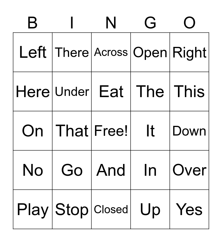 This bingo card has a free space and 24 words: Go, Stop, Eat, Play, Right, Left, Here, There, It, And, The, On, In, Over, Under, Up, Down, Across, This, That, Yes, No, Open and Closed.