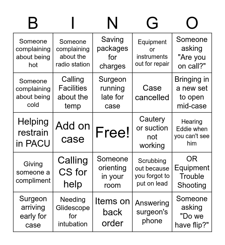 This bingo card has a free space and 24 words: Calling CS for help, Needing Glidescope for intubation, Surgeon running late for case, Surgeon arriving early for case, Someone asking "Are you on call?", Someone complaining about being hot, Someone complaining about being cold, Someone complaining about the radio station, Cautery or suction not working, Someone orienting in your room, Case cancelled, Helping restrain in PACU, Scrubbing out because you forgot to put on lead, OR Equipment Trouble Shooting, Calling Facilities about the temp, Answering surgeon's phone, Hearing Eddie when you can't see him, Saving packages for charges, Bringing in a new set to open mid-case, Add on case, Someone asking "Do we have flip?", Giving someone a compliment, Equipment or instruments out for repair and Items on back order.