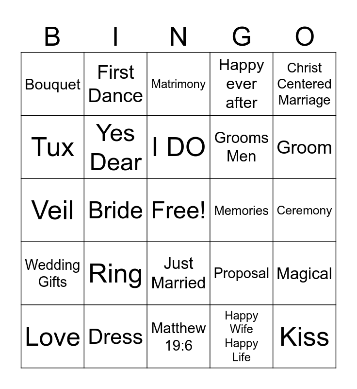 This bingo card has a free space and 24 words: Ring, Dress, I DO, Love, Christ Centered Marriage, Bouquet, Tux, First Dance, Memories, Just Married, Grooms Men, Veil, Proposal, Magical, Yes Dear, Happy Wife Happy Life, Ceremony, Matrimony, Groom, Bride, Kiss, Wedding Gifts, Happy ever after and Matthew 19:6.