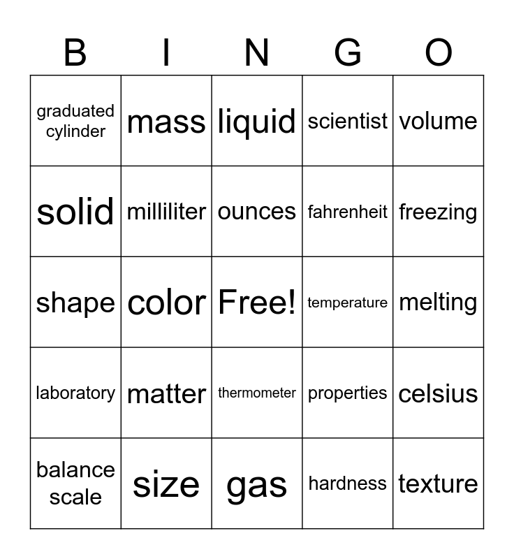 This bingo card has a free space and 24 words: matter, size, ounces, balance scale, volume, graduated cylinder, solid, mass, temperature, thermometer, fahrenheit, shape, properties, celsius, milliliter, hardness, melting, liquid, freezing, color, texture, laboratory, scientist and gas.
