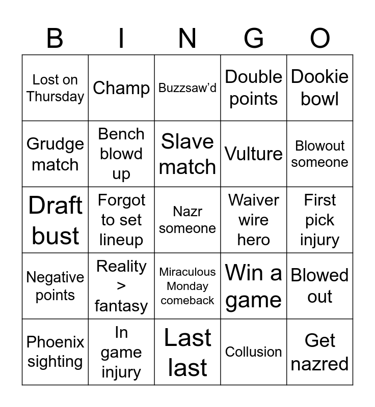 This bingo card has 25 words: Reality > fantasy, Last last, Slave match, Phoenix sighting, Dookie bowl, Lost on Thursday, Grudge match, Champ, Waiver wire hero, Miraculous Monday comeback, Vulture, Draft bust, Win a game, Blowed out, Bench blowd up, Get nazred, First pick injury, Buzzsaw’d, Blowout someone, Forgot to set lineup, Nazr someone, In game injury, Negative points, Double points and Collusion.