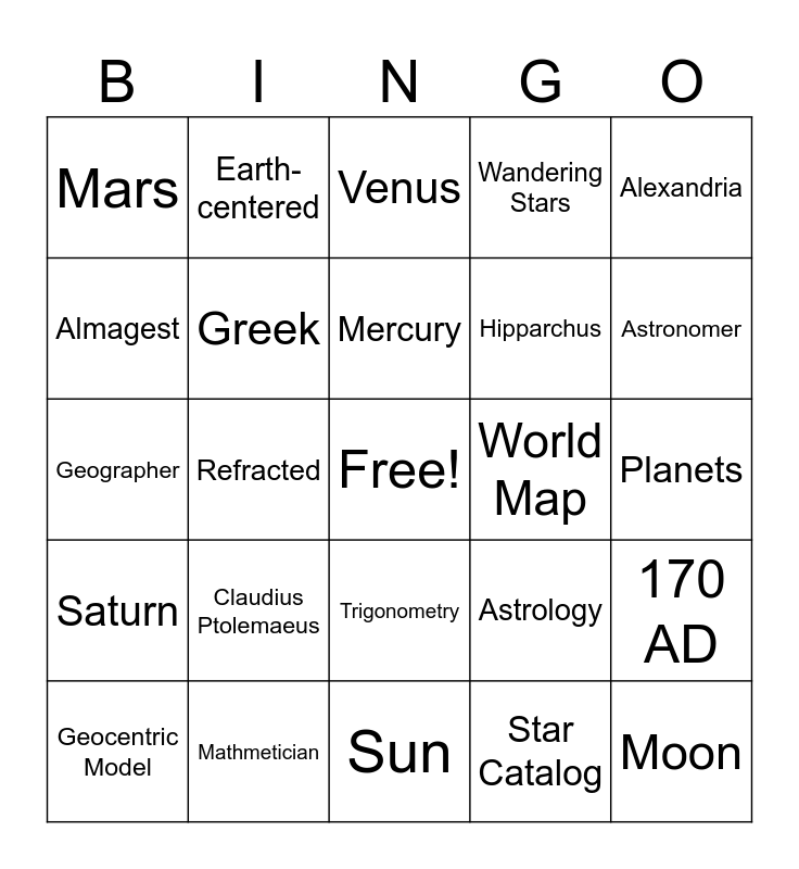 This bingo card has a free space and 33 words: Optics/Optica, Arabic, Refracted, Jupiter, Saturn, Greek, Alexandria, Geocentric Model, Earth-centered, Universe, Mercury, Venus, Latitude, Longitude, World Map, Astronomer, Mathmetician, Geographer, Claudius Ptolemaeus, Astrology, Trigonometry, Music, Mars, Planets, Sun, Moon, Wandering Stars, Hipparchus, Almagest, 170 AD, Stars, Star Catalog and Egyptian.