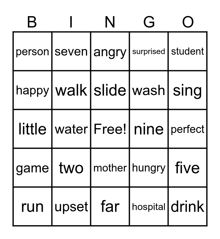 This bingo card has a free space and 53 words: one, two, three, four, five, six, seven, eight, nine, zero, person, bag, mother, hospital, school, game, water, slide, flower, student, happy, upset, angry, surprised, scared, run, jump, swim, dance, sing, study, watch, write, read, drink, eat, walk, play, wash, clean, outside, inside, far, near, huge, little, bright, loose, hungry, perfect, brave, lovely and dizzy.