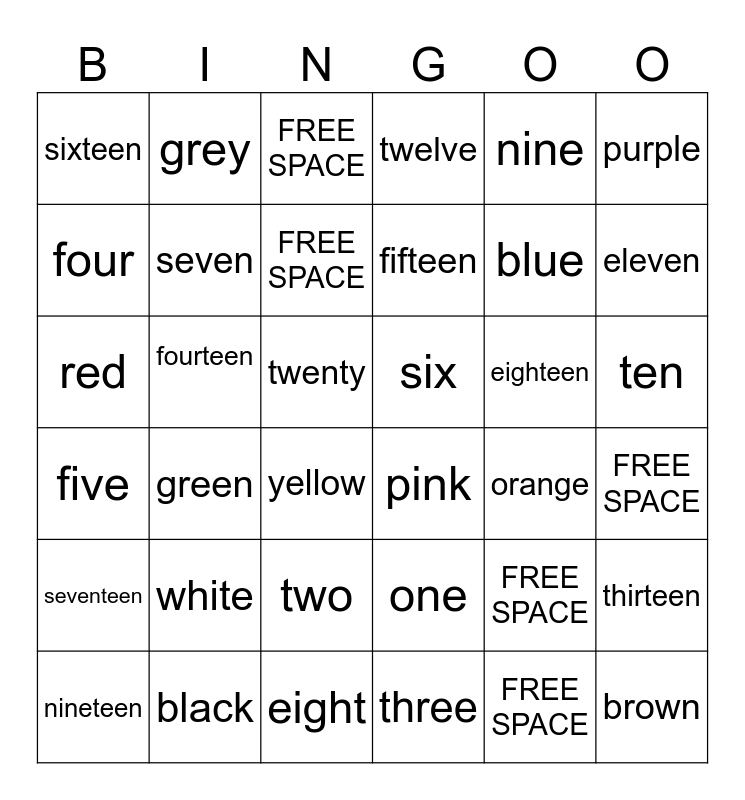 This bingo card has 36 words: one, two, three, four, five, six, seven, eight, nine, FREE SPACE, eleven, twelve, thirteen, fourteen, fifteen, sixteen, seventeen, eighteen, red, FREE SPACE, twenty, green, pink, yellow, orange, grey, blue, black, FREE SPACE, purple, brown, nineteen, FREE SPACE, ten, white and FREE SPACE.