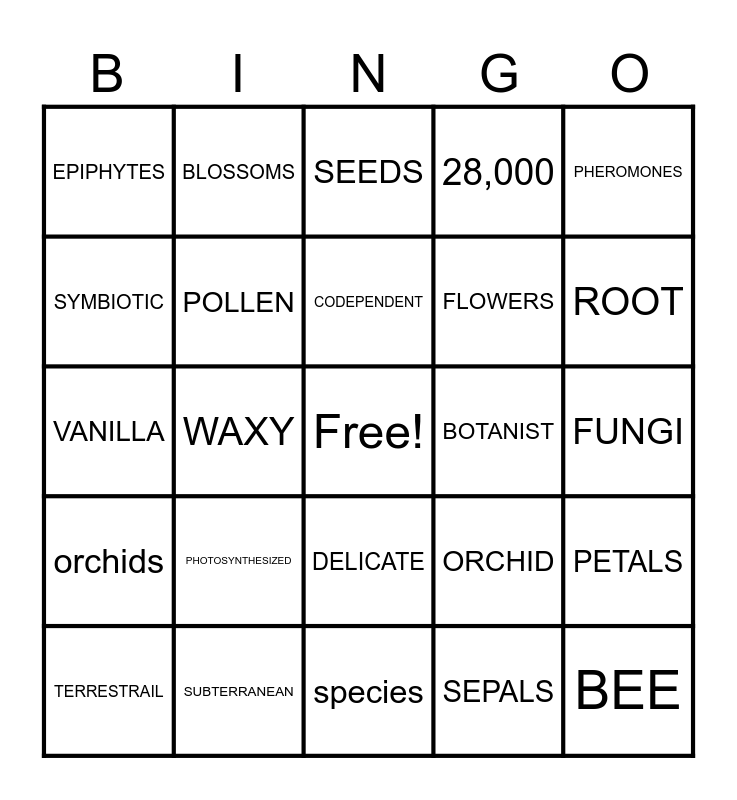 This bingo card has a free space and 24 words: PHOTOSYNTHESIZED, SUBTERRANEAN, CODEPENDENT, TERRESTRAIL, PHEROMONES, EPIPHYTES, SYMBIOTIC, BLOSSOMS, BOTANIST, DELICATE, FLOWERS, VANILLA, ORCHID, PETALS, POLLEN, SEPALS, FUNGI, SEEDS, ROOT, WAXY, BEE, orchids, 28,000 and species.