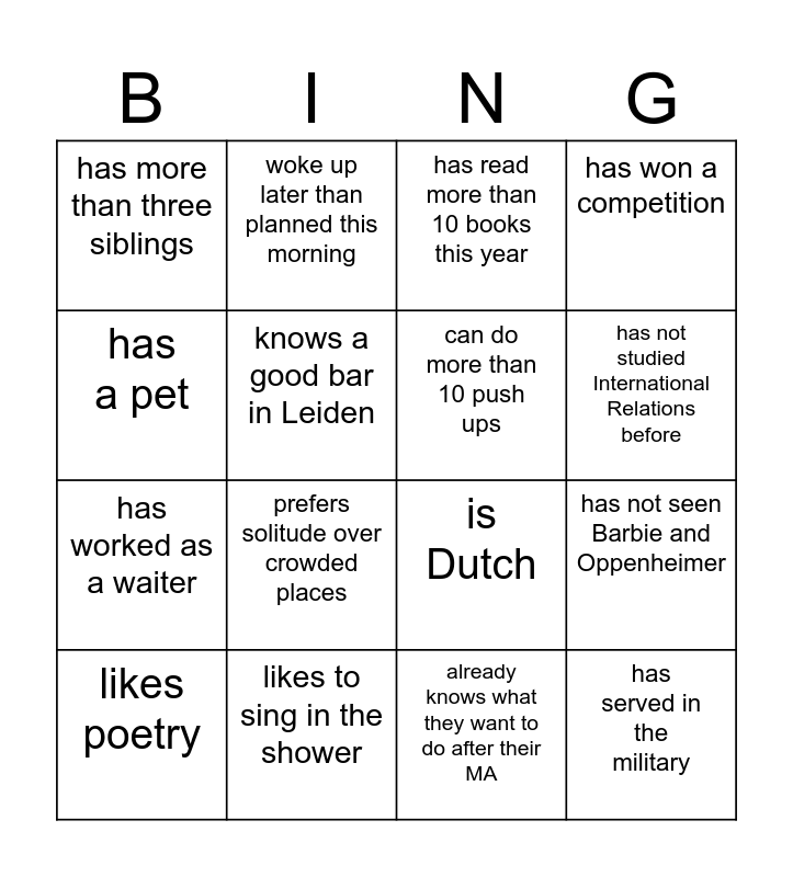 This bingo card has 16 words: likes to sing in the shower, has not seen Barbie and Oppenheimer, has read more than 10 books this year, has more than three siblings, has worked as a waiter, woke up later than planned this morning, is Dutch, already knows what they want to do after their MA, has a pet, knows a good bar in Leiden, likes poetry, has won a competition, prefers solitude over crowded places, has not studied International Relations before, can do more than 10 push ups and has served in the military.