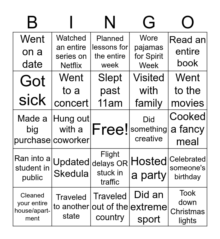This bingo card has a free space and 24 words: Updated Skedula, Traveled to another state, Slept past 11am, Cleaned your entire house/apart-ment, Read an entire book, Went on a date, Got sick, Watched an entire series on Netflix, Did something creative, Flight delays OR stuck in traffic, Visited with family, Made a big purchase, Hosted a party, Celebrated someone's birthday, Went to a concert, Did an extreme sport, Cooked a fancy meal, Planned lessons for the entire week, Went to the movies, Hung out with a coworker, Took down Christmas lights, Ran into a student in public, Wore pajamas for Spirit Week and Traveled out of the country.