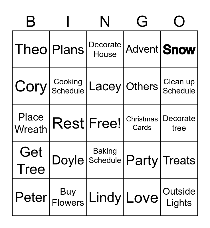 This bingo card has a free space and 25 words: Doyle, Lindy, Lacey, Peter, Snow, Theo, Cory, Plans, Christmas Cards, Baking Schedule, Others, Place Wreath, Party, Treats, Cooking Schedule, Celebrate birth of Jesus, Decorate tree, Decorate House, Clean up Schedule, Rest, Outside Lights, Buy Flowers, Get Tree, Advent and Love.