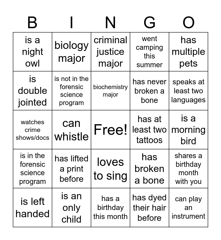 This bingo card has a free space and 34 words: has two or more siblings, has dyed their hair before, has been out of the country, is from outside of texas, is in the forensic science program, is not in the forensic science program, has multiple pets, is left handed, biology major, chemistry major, biochemistry major, criminal justice major, not a bio, chem, bio-chem, or crim jus major, has at least four piercings, has at least two tattoos, speaks at least two languages, is an only child, watches crime shows/docs, has lifted a print before, has broken a bone, loves to sing, has worked in a lab, is a night owl, is a morning bird, has a birthday this month, can play an instrument, went camping this summer, shares a class with you, has never broken a bone, is double jointed, is ambidextrous, can whistle, shares a birthday month with you and can cook or bake.