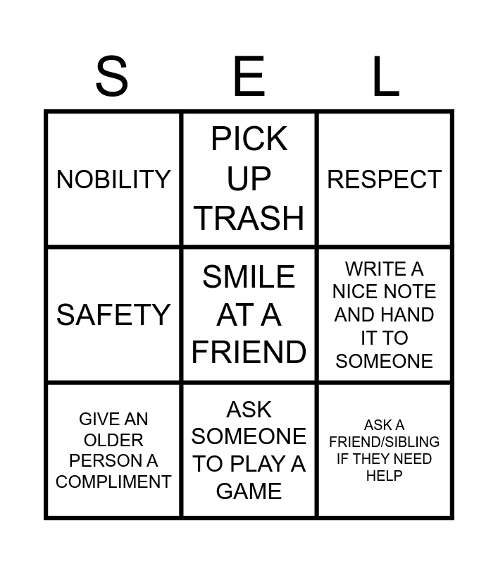 This bingo card has 17 words: HONESTY, OWNERSHIP, RESPECT, NOBILITY, Free!, SAFETY, SHARE, GIVE AN OLDER PERSON A COMPLIMENT, ASK SOMEONE TO PLAY A GAME, WRITE A NICE NOTE AND HAND IT TO SOMEONE, PUSH A CHAIR IN, OPEN THE DOOR FOR SOMEONE, SMILE AT A FRIEND, PICK UP TRASH, ASK A FRIEND/SIBLING IF THEY NEED HELP, SMILE AT A YOUNGER PERSON and SAY GOOD MORNING TO 5 PEOPLE.