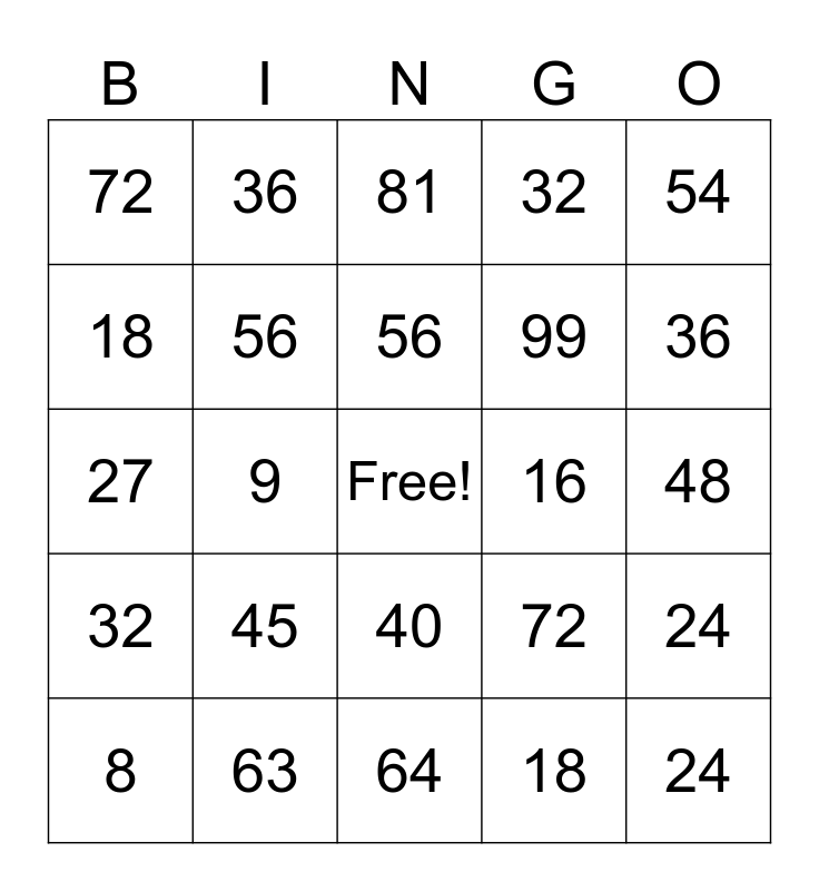 This bingo card has a free space and 29 words: 8, 80, 9, 64, 72, 81, 56, 45, 16, 63, 48, 24, 64, 18, 36, 48, 40, 32, 54, 27, 72, 54, 99, 18, 32, 36, 24, 56 and 48.