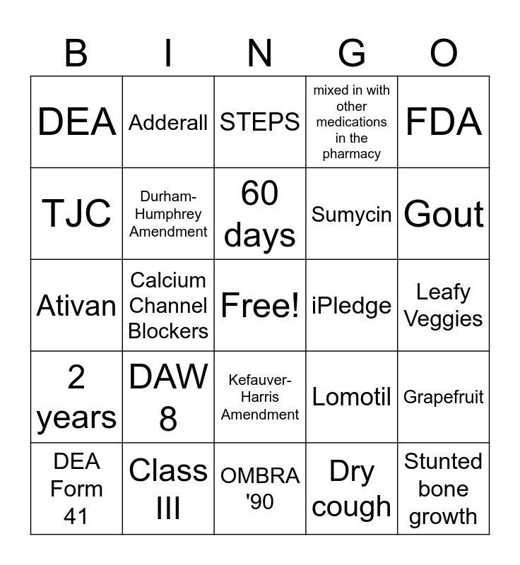 This bingo card has a free space and 24 words: DAW 8, Class III, 60 days, DEA Form 41, FDA, DEA, TJC, Adderall, iPledge, Kefauver-Harris Amendment, Sumycin, Ativan, Lomotil, Grapefruit, Durham-Humphrey Amendment, Dry cough, Leafy Veggies, STEPS, Gout, Calcium Channel Blockers, Stunted bone growth, 2 years, mixed in with other medications in the pharmacy and OMBRA '90.