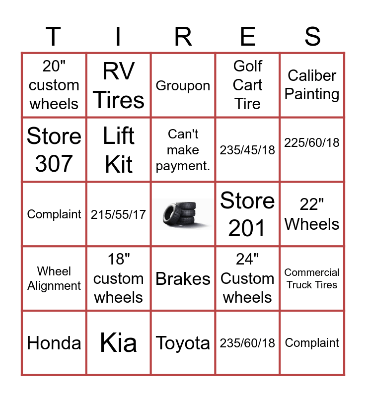 This bingo card has a free space and 29 words: Honda, Store 304, 215/55/17, Needs to make a payment., 20" custom wheels, Groupon, Lift Kit, 18" custom wheels, Store 201, Kia, 22" Wheels, Complaint, Toyota, 235/60/18, 225/60/18, BMW, Brakes, Wheel Alignment, Caliber Painting, Complaint, 24" Custom wheels, Lexus, 235/45/18, Store 307, Golf Cart Tire, RV Tires, Commercial Truck Tires, Can't make payment. and Payment Arrangement.