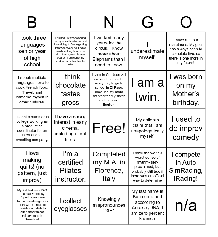 This bingo card has a free space and 24 words: I'm a certified Pilates instructor., I collect eyeglasses, Living in Cd. Juarez, I crossed the border every day to go to school in El Paso, because my mom wanted for my sister and I to learn English., My first task as a PAS intern at Embassy Copenhagen more than a decade ago was to fly with a group of Danish journalists to our northernmost military base in Greenland., I have run four marathons. My goal has always been to complete five, so there is one more in my future!, I took three languages senior year of high school, I speak multiple languages, love to cook French food, Travel, and immerse myself in other cultures., I picked up woodworking as my covid hobby and still love doing it. Since getting into woodworking, I have made cutting boards, a dice tower, and cheese boards. I am currently working on a tea box for wife., My children claim that I am unapologetically myself., Completed my M.A. in Florence, Italy, I am a twin., I spent a summer in college working as a production coordinator for an international wrestling company., I have the world's worst sense of rhythm- self-proclaimed, but probably still true if there was an official way to determine, I compete in Auto SimRacing, iRacing!, I think chocolate tastes gross, My last name is Barcelona and according to AncestryDNA, I am zero percent Spanish., I used to do improv comedy, I worked many years for the circus. I know more about Elephants than I need to know., I was born on my Mother’s birthday., I have a strong interest in early cinema, including silent films., n/a, I love making quilts! (no pattern, just improv), I underestimate myself. and Knowingly mispronounces "GIF".